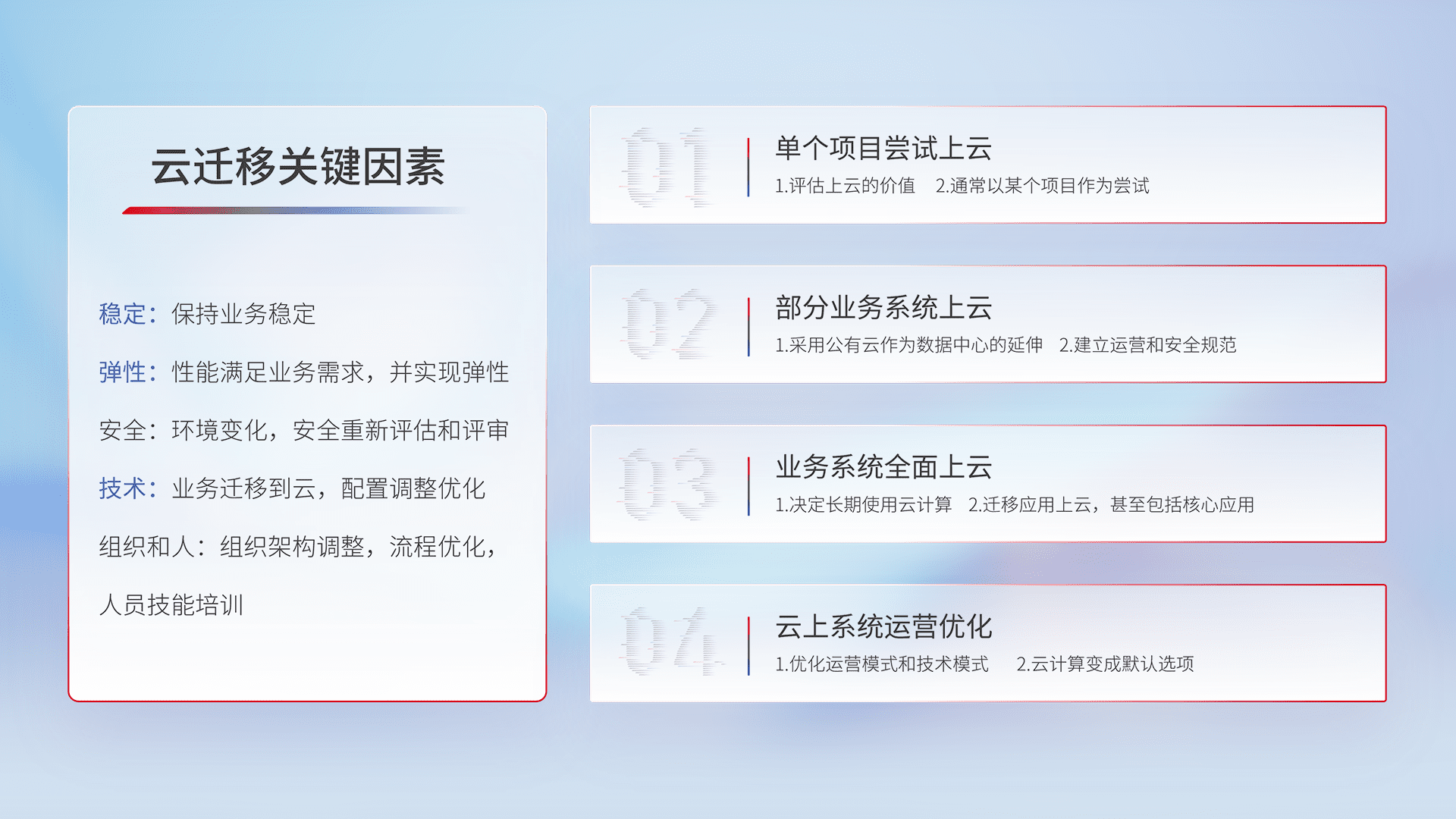 结合实际业务,,从规划设计、、、、云平台选型、、云原生改造、、、、数据迁移、、、集成交付,,迁移全过程为客户识别最佳上云路径,,,做好风险识别管理,,,设计网络架构、、、、身份权限、、、安全审计合规、、操作审计、、、、日志审计、、、监控告警策略、、多站点容灾设计等,,对云上基础设施进行整体规划,,,,提升IT治理水平,,以满足弹性、、、、高可用、、、、高性能的需求。。